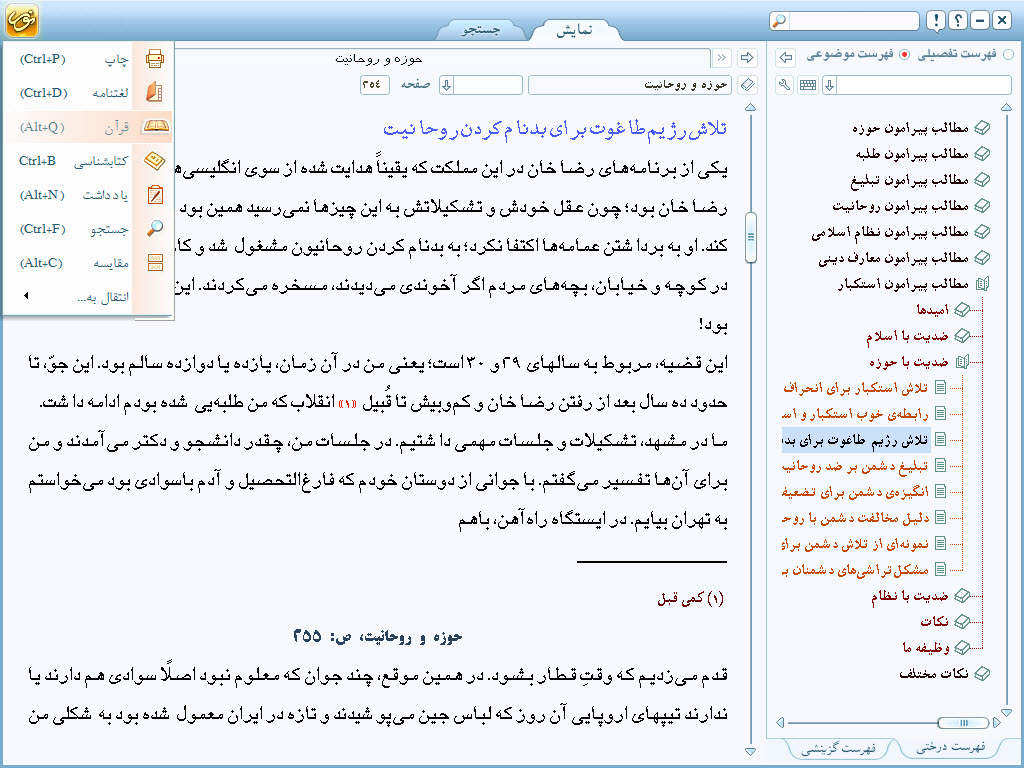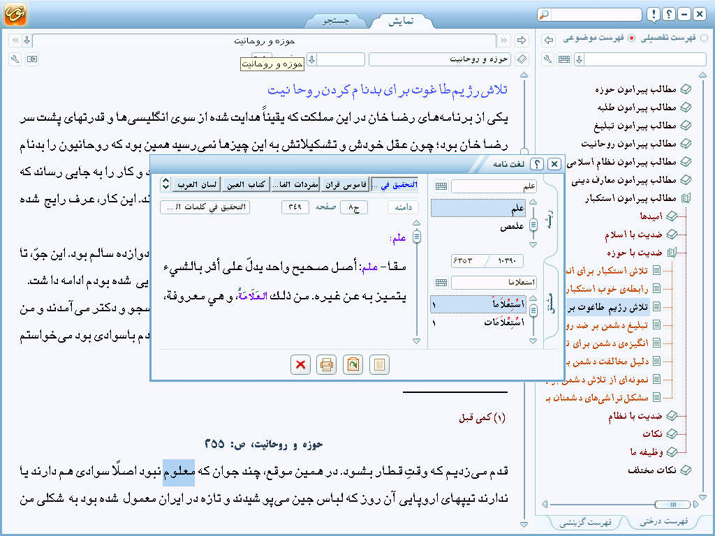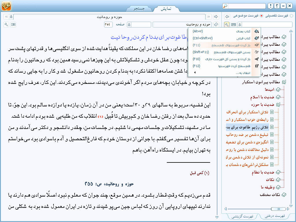 – قابلیت انتخاب عنوان كتاب، جلد و صفحه به همراه امكان گسترده كردن صفحه متن و فهرست